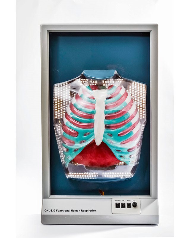 Električni model –demonstrira disanje sa kretanjem grudnog koša sa torakalnim organima i sa kretanjem dijafragme. Izrađen od plastike. Radi na 220 V, 50 Hz.