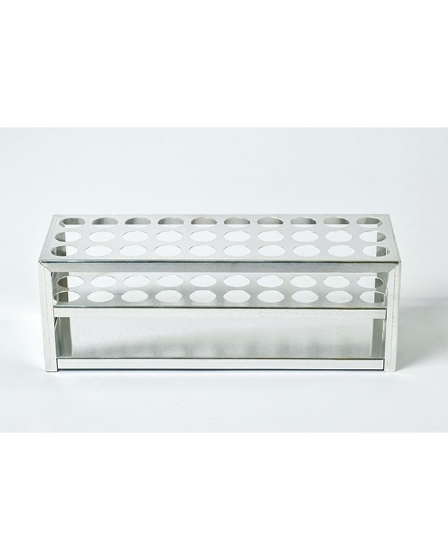 Polica za epruvete, izrađena od aluminijuma. Ima tri reda sa po deset otvora.