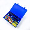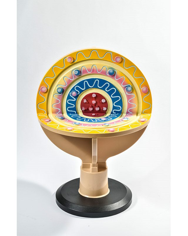 Model atoma u 3D gde se mogu videti jezgro i elektronski omotač, kao i najmanje čestice: protoni, neutroni i elektroni. Izrađen od plastike.