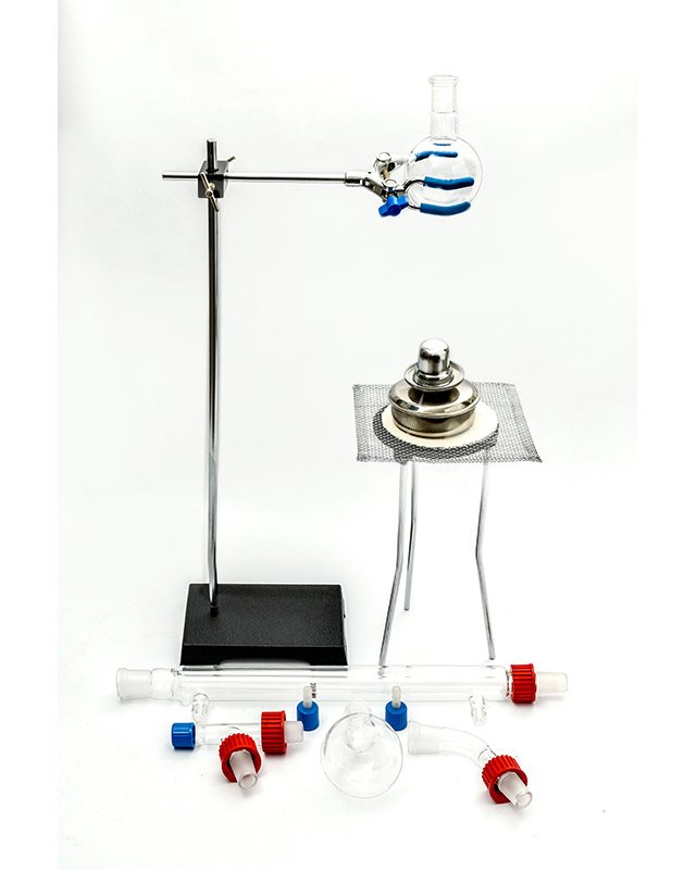 Set sadrži špiritusnu lampu sa dimenzijama 13h10 cm, Libigov kondenzator sa dužinom 20 cm, erlenmajer od 250 ml, tikvicu za frakcionu destilaciju od 500 ml i tikvicu za destilat od 250 ml.