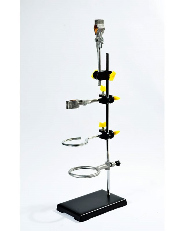 Držač sa 4 manja držača za laboratorijske posude, izrađen od metala; postavljen na podlogu od plastike ili od ekvivalentnog materijala.