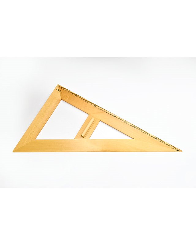 Trougao sa drškom, izrađen od drveta, lenjir koji meri dužinu do 60 cm. Za crtanje pravih linija i uglova od 30`, 60′ i 90`