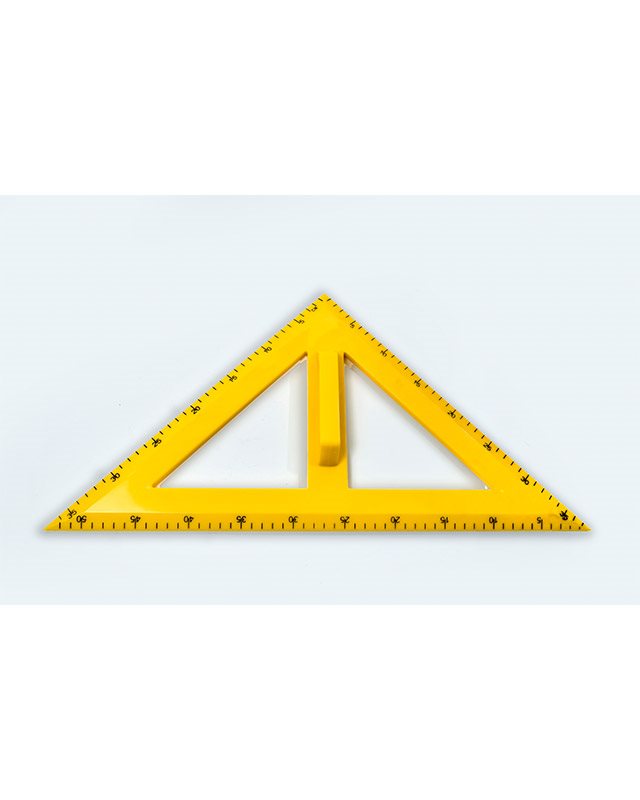 Trougao sa drškom, izrađen od plastike, lenjir koji meri dužinu do 50 cm. Za crtanje pravih linija i uglova od 45º i 90º.