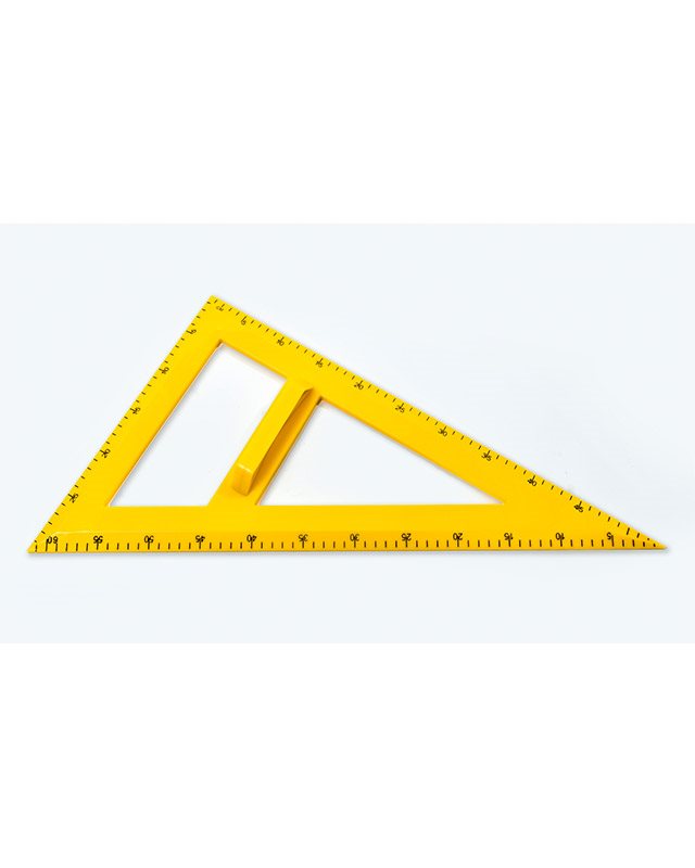 Trougao sa drškom, izrađen od plastike, lenjir koji meri dužinu do 60 cm. Za crtanje pravih linija i uglova od 30º, 60º i 90º