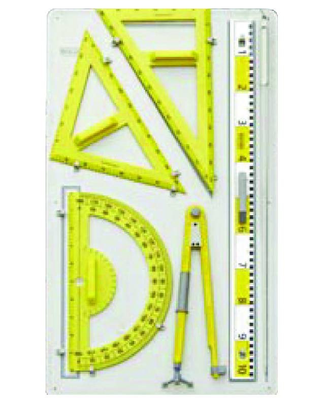 Matematički set sadrži: nejednakostranični trougao (sa lenjirom dužine od 60 cm), jednakostraničan trougao (sa lenjirom od 50 cm), lenjir (od 100 cm), šestar (sa dužinom krakova 50 cm) i uglomer (sa lenjirom od 50 cm). Izrađeni od plastike