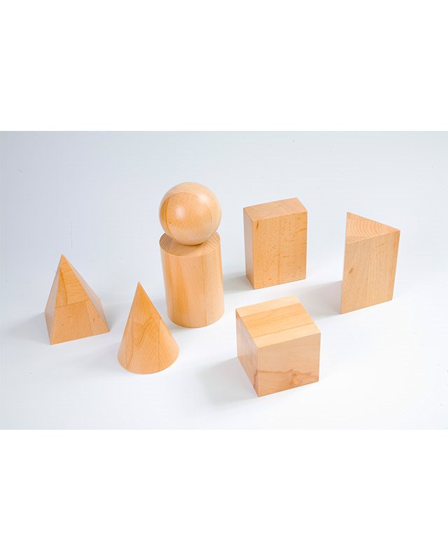 Set geometrijskih tela: piramida, cilindar, kupa, lopta, prizma, kocka i kvadar. Izrađeni od drveta, sa visinom i širinom tela 150 mm.