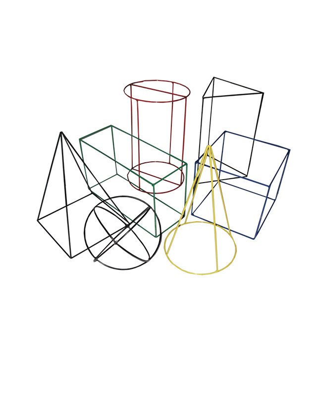 Set geometrijskih tela: piramida, cilindar, kupa, kvadar, lopta, prizma i kocka. Izrađeni od žice debljine 3 mm i visine i širine tela 150 mm