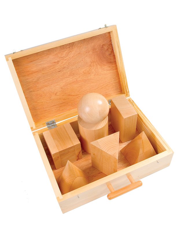 Set geometrijskih tela: piramida, kvadar, lopta, kupa i kocka za dobijanje jasne slike u prostoru. Izrađeni od drveta. Paket: kutija